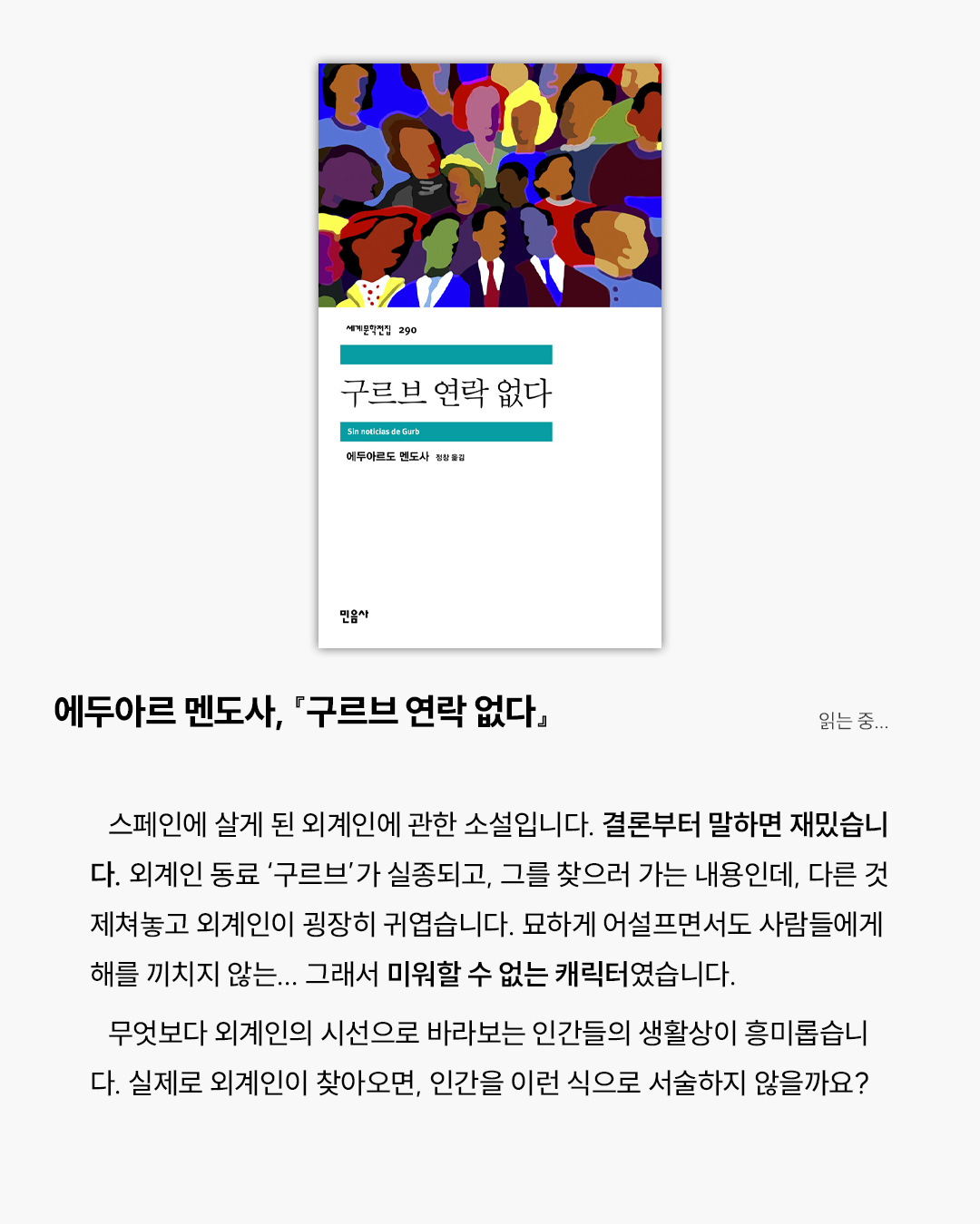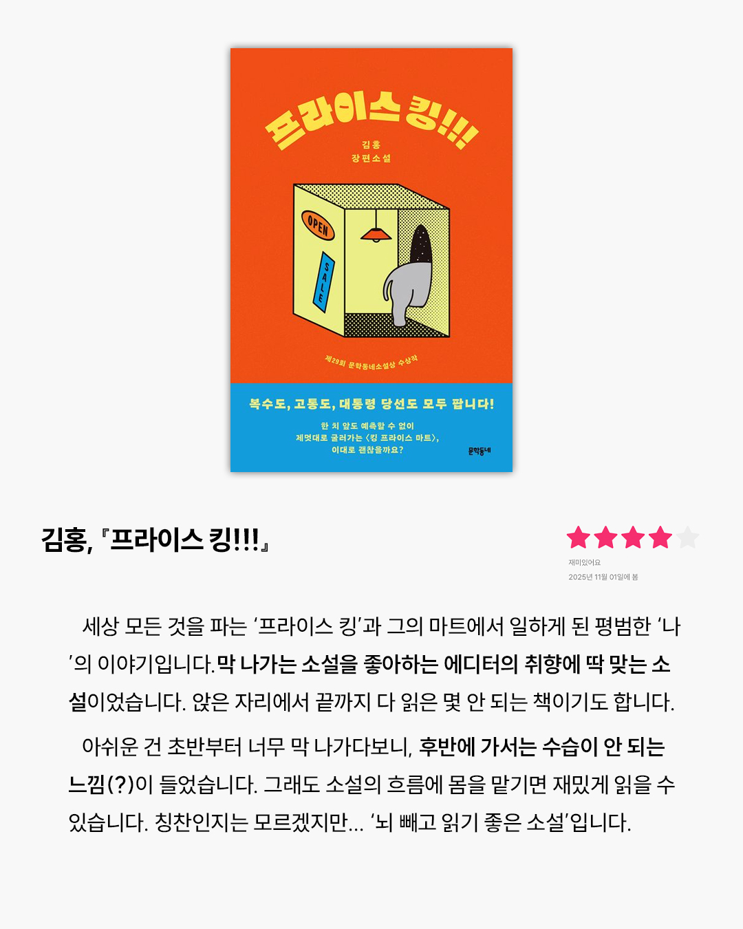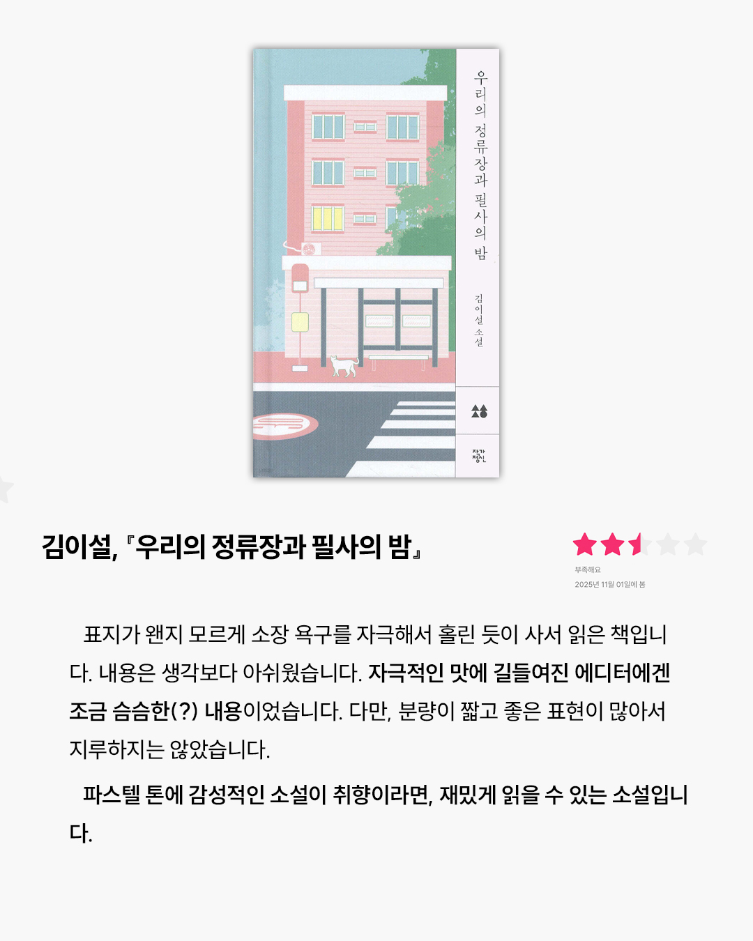 작년부터 길고 긴 통근 시간을 버티기 위해 소설책을 한 권씩 들고 다니기 시작했어요. 집에선 그렇게 안 읽히던 책이, 이상하게도 지하철에선 술술 넘어가더라고요. 그래서 준비한 에디터 주관 100% 소설 리뷰! 일관성도 없고 멋진 독서 철학도 없지만, 그때그때 마음에 남은 취향을 또렷하게 담아봤습니다. 이 중에 여러분의 인생책이 하나쯤은 있기를 바라요✨